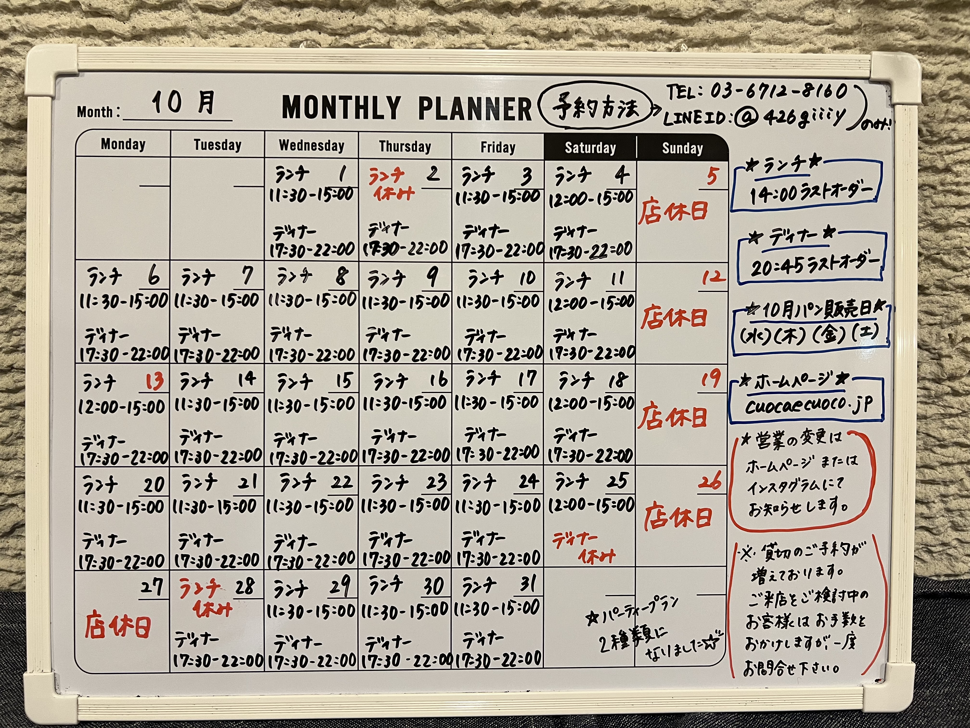 《10月の営業予定》です。